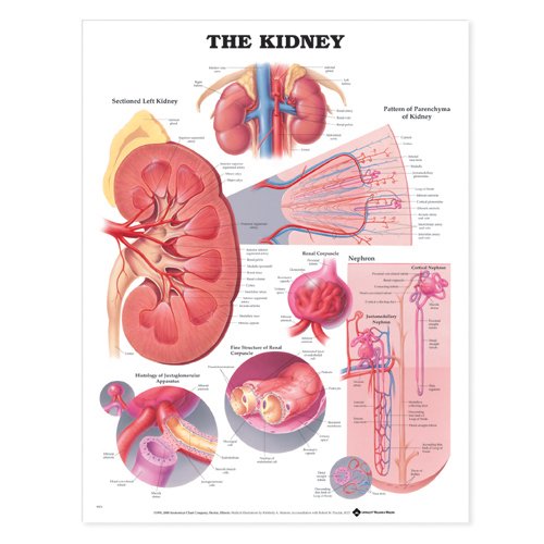 This chart shows the kidney and surrounding organs, veins and arteries. Illustrations show sectioned left kidney and provide a close-up view of pattern of parenchyma of kidney. The chart also shows nephron, renal corpuscle (including fine structure), and histology of juxtaglomerular apparatus.